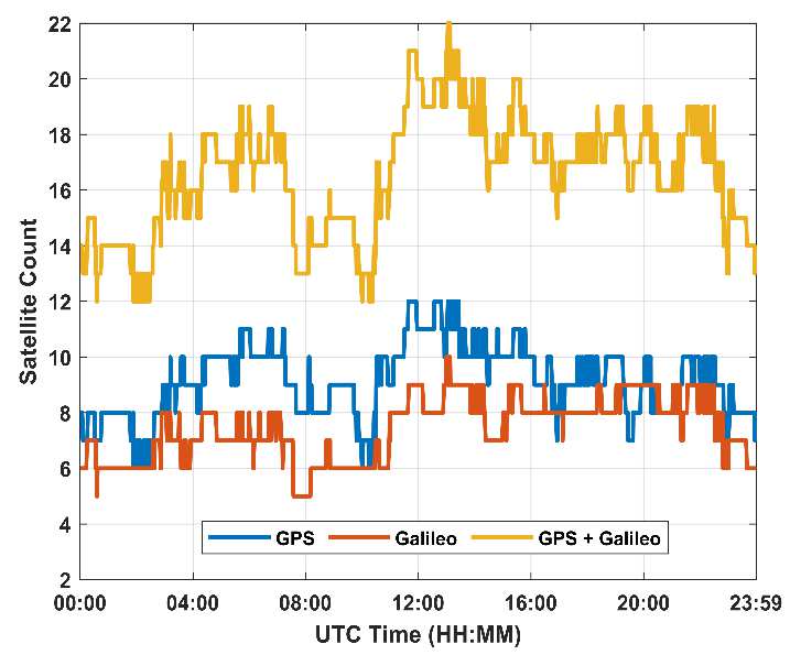 结果显示,GPS与伽利略单系统性能存在差异:1小时短时长数据中,GPS二维精度优于2米,优于伽利略(不足5米);24小时长时长数据中,伽利略三维精度更优(优于7米),GPS三维精度约5米。二者组合模式表现最佳,不仅二维、三维精度均超单系统,还提升了卫星可见数量(GPS为6-12颗、伽利略为5-10颗,组合后达12-22颗),同时降低东、北、天向误差,尤其优化了水平定位精度。此外,精度存在时间波动,日出前因电离层稳定性能更佳,白天受太阳活动、卫星几何不佳等影响,精度有所下降。