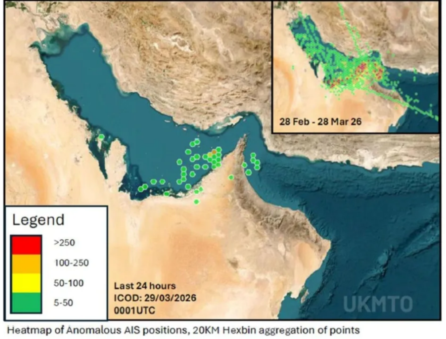 海贸海事新闻网站2026年3月30日报道,3月27-28日,波斯湾区域的全球导航卫星系统(GNSS)、全球定位系统(GPS)及船舶自动识别系统(AIS)干扰水平出现显著回落,该变化与霍尔木兹海峡船舶通航量提升同步发生。联合海事信息中心(JMIC)在3月29日发布的通告中指出,在过去24-48小时内,该区域导航与船舶识别信号干扰已明显缓和,当前状态为“零星、局域化”,与此前数周的大范围干扰形成鲜明对比——此前的干扰曾导致船舶AIS数据出现位置堆叠、航速超90节、陆地位置锁死等严重异常。与此同时,JMIC监测数据显示,3月28-29日霍尔木兹海峡日均通航船舶升至11艘,较27日的4艘、近期日均1-2艘的水平大幅回升,但仍仅为历史日均138艘正常通航水平的零头。船舶跟踪平台Tankertrackers.com3月29日发布的观测结果显示,其通过卫星影像标记的300余艘油轮未发现GPS干扰迹象,推测这一变化与霍尔木兹海峡过境船舶资质核验工作相关。伊朗方面对海峡通行实施差异化管控,允许其认定的友好国家船舶过境,已与中国、印度、泰国、马来西亚、西班牙等国达成通行安排;据披露,伊朗向过境船舶收取约200万美元的安全通行费,支持人民币或加密货币结算,通行资质核验综合考量货物起运地、目的地等多维度因素。